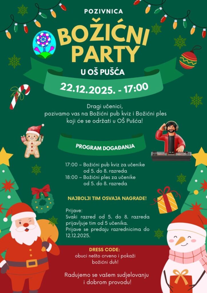 pozivamo vas na Božićni pub kviz i Božićni ples koji će se održati 22.12.2025. u 17:00 u našoj školi!