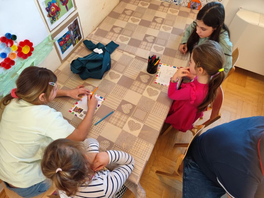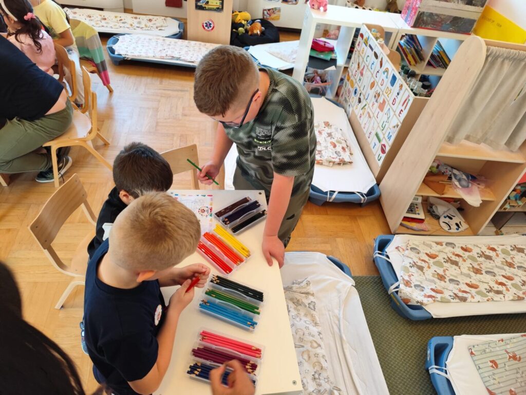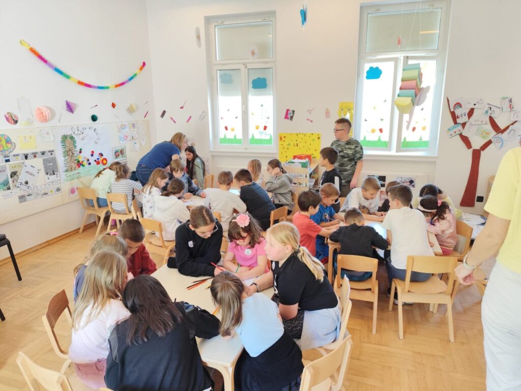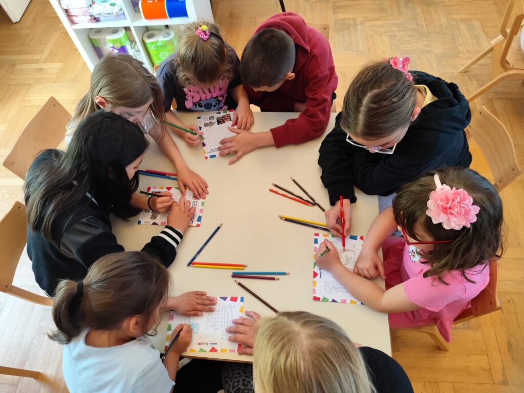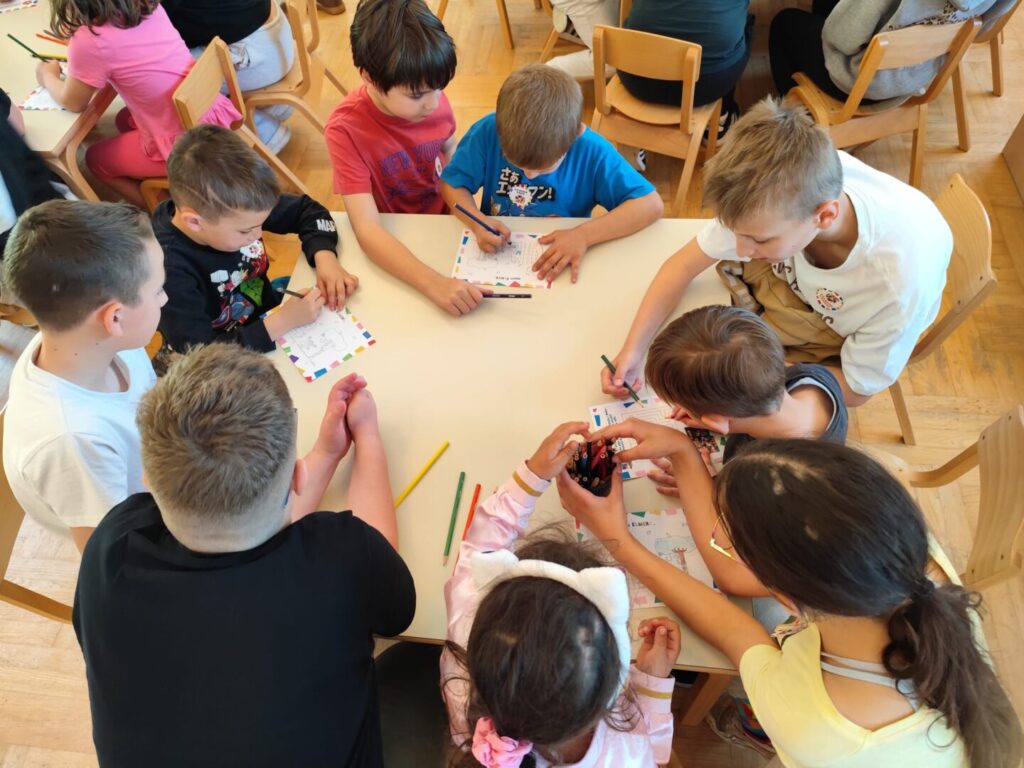 Nakon čitanja priče školarci i vrtićanci su se družili rješavajući labirinte i bojeći bojanke. Dok se vrtićanci vesele odlasku u školu, četvrtaši su se s nostalgijom prisjetili svojih bezbrižnih i veselih dana u vrtiću.
